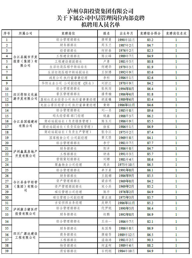 根據(jù)《瀘州阜陽(yáng)投資集團(tuán)有限公司關(guān)于下屬公司中層管理崗位內(nèi)部競(jìng)聘工作的公告》(瀘阜投發(fā)〔2020〕21號(hào))的規(guī)定,經(jīng)阜陽(yáng)集團(tuán)黨委會(huì)研究決定,擬聘用唐琿蔓等39人為瀘州阜陽(yáng)投資集團(tuán)有限公司下屬公司中層管理人員?,F(xiàn)面向社會(huì)公示7日,公示時(shí)間2020年6月19日至2020年6月25日。公示期間,如有問(wèn)題,請(qǐng)及時(shí)向?yàn)o州阜陽(yáng)投資集團(tuán)有限公司組織與人力資源管理部反映。要求舉報(bào)者署實(shí)名,實(shí)事求是地反映問(wèn)題,并提供必要的調(diào)查線(xiàn)索。