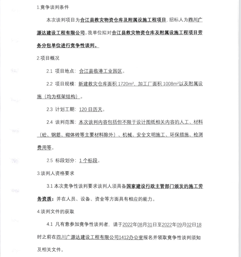 合江縣救災(zāi)物資倉庫及附屬設(shè)施工程項(xiàng) 目 勞務(wù)分包單位競爭性談判的公告