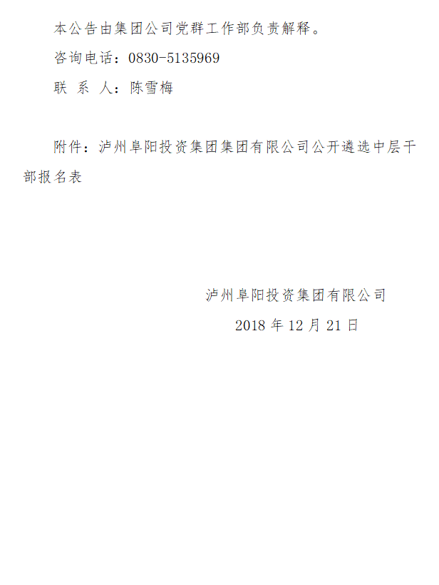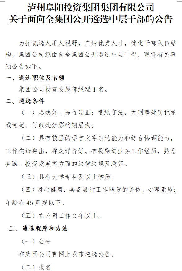 瀘州阜陽投資集團(tuán)集團(tuán)有限公司關(guān)于面向全集團(tuán)公開遴選中層干部的公告
