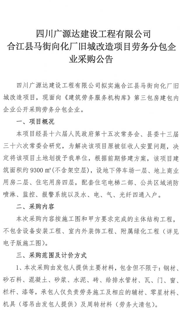 四川廣源達建設工程有限公司 合江縣馬街向化廠舊城改造項目勞務分包企業(yè)采購公告.doc