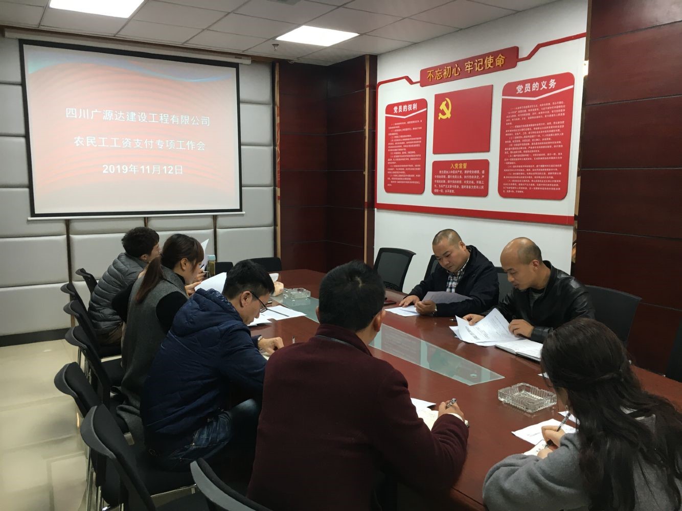 2019年11月12日,四川廣源達(dá)建設(shè)工程有限公司譙棣升董事長(zhǎng)主持召開農(nóng)民工工資支付專項(xiàng)工作會(huì),公司各部門負(fù)責(zé)人、項(xiàng)目經(jīng)理參會(huì)。