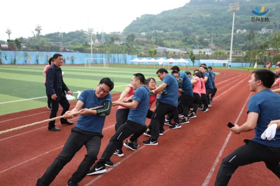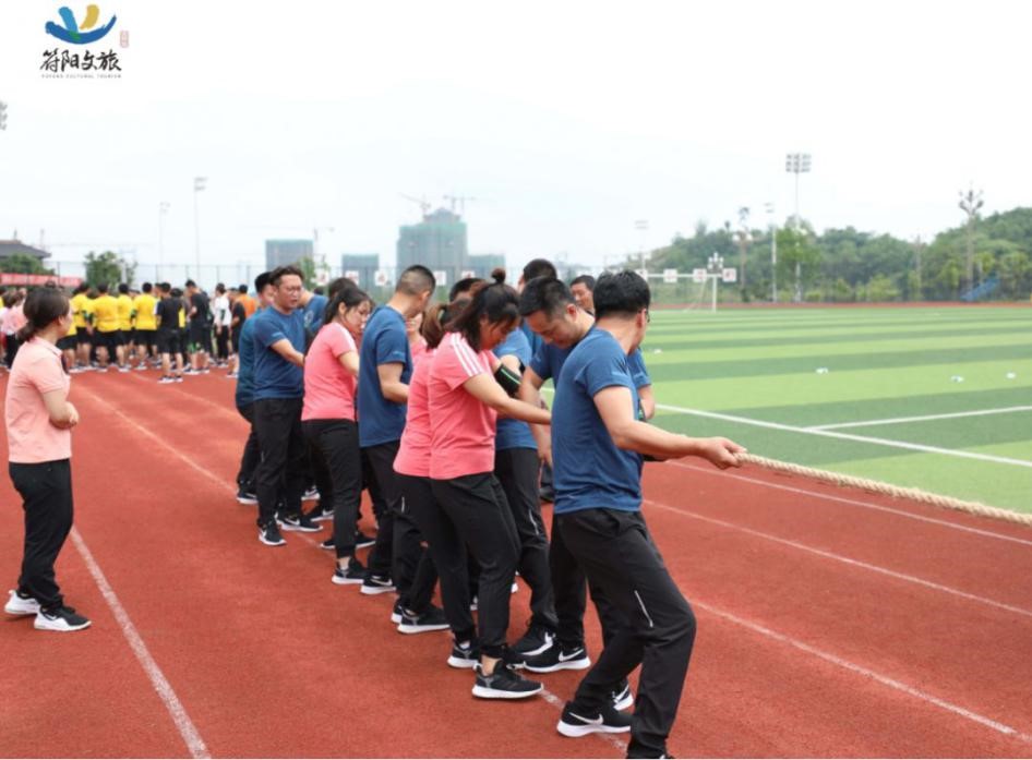 隨著哨聲一響,我們雙手握緊長繩,咬緊牙關(guān)向后拉,為了把握節(jié)奏形成合力,心里默念著“一二、一二”,場上一時僵持難下,但難敵強(qiáng)悍對手,第一局廣源達(dá)勝。這仿佛符合多數(shù)人的預(yù)期,但我們怎會被拘于這固定印象,越戰(zhàn)越勇才是符陽文旅人的風(fēng)姿。第二場對決比第一場更加艱難,一開場廣源達(dá)占據(jù)絕對優(yōu)勢,我們險被拉到了終線,全憑一口氣死撐,牙關(guān)咬緊,身體后傾,不斷降低重心,腳步穩(wěn)扎,做著別人眼里無畏的掙扎。一定不能越線!在超高壓下堅持了十余秒,那一刻拼的就是韌勁!一群瘦弱的文旅人憑著一股拼勁慢慢把賽場主動權(quán)掌握在了自己手中,每向后移動一步,心里的勁更足了,如荒漠迷路的旅者遇見了綠洲,我們也尋得了力量之源。當(dāng)現(xiàn)場歡呼聲響起時,我們已癱坐一片,不敢置信,我們贏啦!