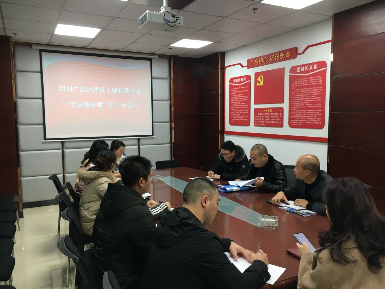 2019年11月3日,四川廣源達建設(shè)工程有限公司譙棣升董事長主持召開“憲法宣傳周”職工學(xué)習(xí)會議,公司全體職工參加。