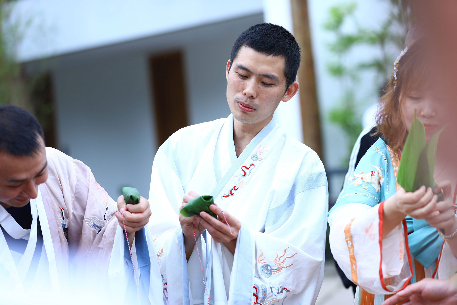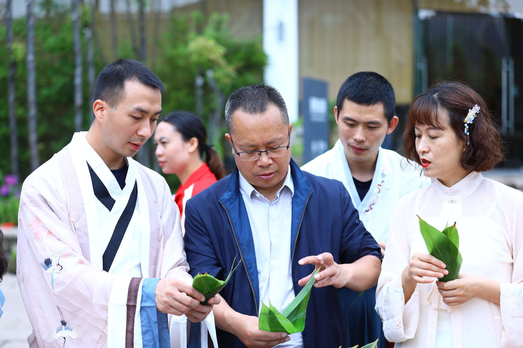 龍掛山景區(qū)是阜陽(yáng)集團(tuán)下屬符陽(yáng)文旅公司打造的的文 化休閑度假旅游目的地, 景區(qū)云霧如海, 美景如畫(huà), 建筑獨(dú) 具傳統(tǒng)川南民宿特色。 活動(dòng)中, 阜陽(yáng)集團(tuán)員工身著漢服, 人 與自然情景交融、交相輝映,仿若穿越到了“狗吠深巷中、 雞鳴桑樹(shù)顛”的古代美好田園生活。在見(jiàn)禧 . 山語(yǔ)的院子里, 大家圍成一圈, 開(kāi)展包粽子比賽。 員工們踴躍參加、 興致高 漲, 集團(tuán)總經(jīng)理任東財(cái)和員工們一起動(dòng)手, 互相學(xué)習(xí)、 邊學(xué) 邊包、 比拼手藝, 包出了三角形、 長(zhǎng)方形、 圓錐形等形態(tài)各 異的粽子,現(xiàn)場(chǎng)洋溢著歡樂(lè)的節(jié)日氣氛。